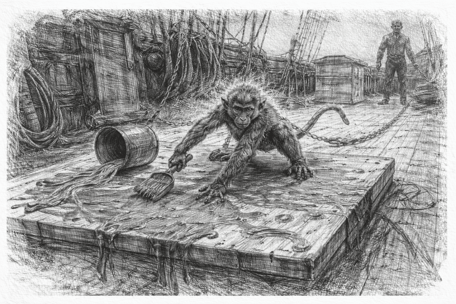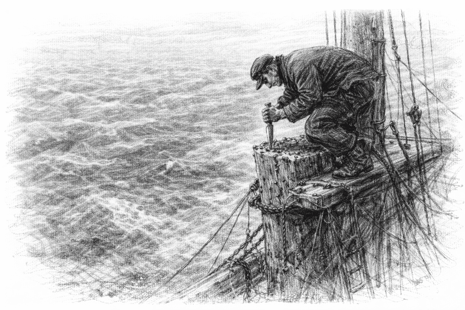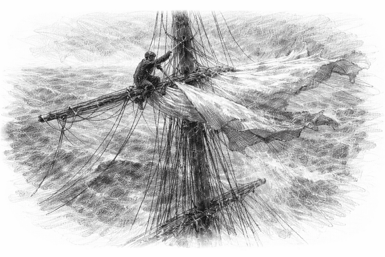 Then, one afternoon of fair wind and weather, the first mate came to me with orders to get a bucket of tar and proceed to tar all the fore-rigging, and see to it that there were…