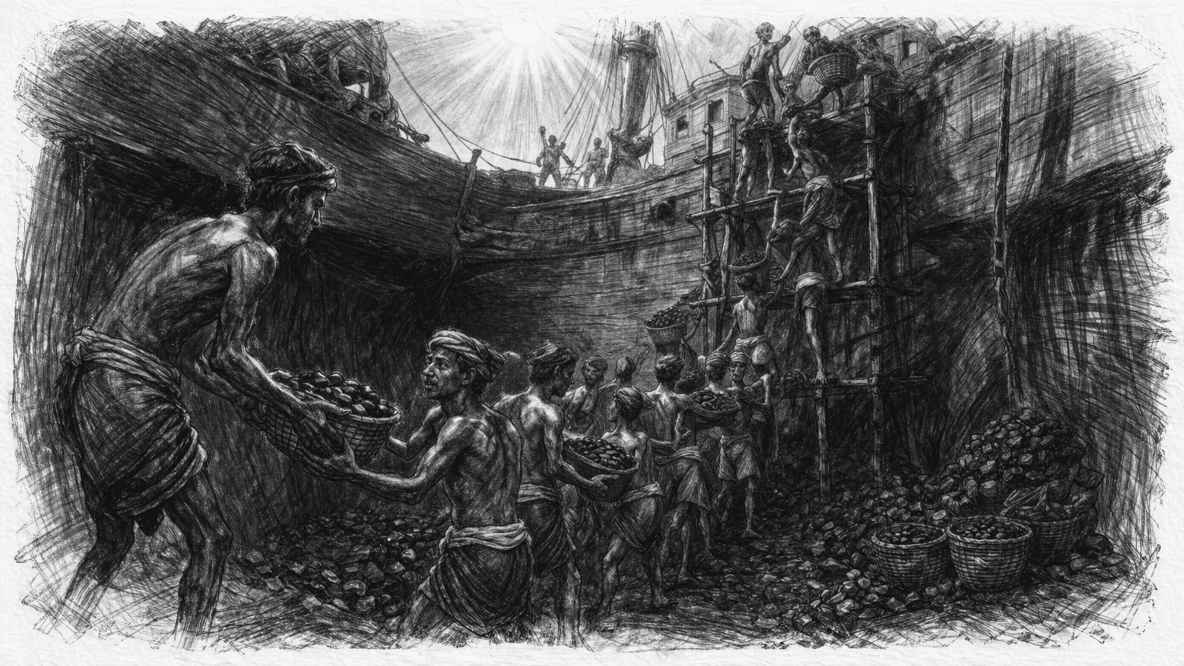 The unloading of coal began. A large lighter was brought along-side, and with it about 80 hindoos or coolies. It is too hot here for Europeans to do such hard work. These coolies…